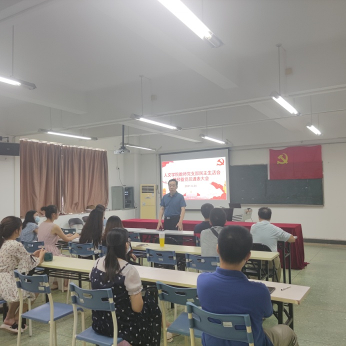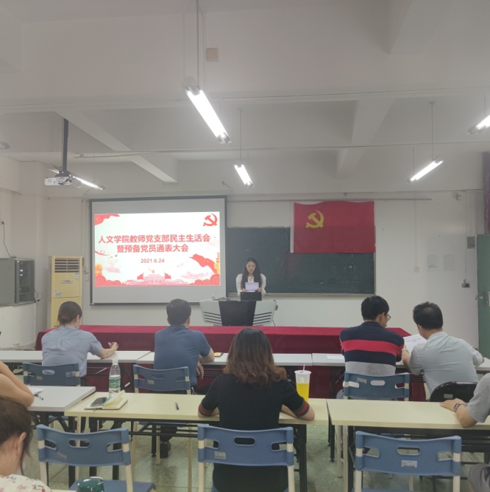 6月24日下午,人文学院教师党支部在人文艺术楼513会议室召开组织生活会暨预备党员通表大会,学校党委副书记、人文学院院长鲁岩,人文学院教师党支部全体党员参加会议。会议由教师党支部书记刘君主持。