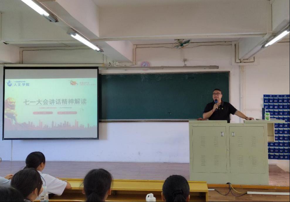 自党史学习教育开展以来,人文学院党总支坚持理论武装在前,强化政治引领,推动党史学习教育深入师生、深入基层、深入人心。9月22日上午9:00,人文学院党总支副书记彭聪在人文艺术楼505阶梯课室为学前教育1-2班新生讲授“思政第一课”。