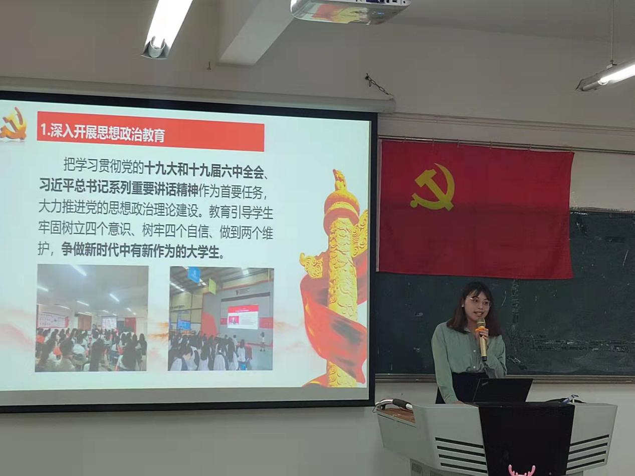 首先由教师党支部书记尚东玲作述职报告,她对2021年支部工作进行总结,并表示要严抓党员思想建设,开展严格规范的党内政治生活,加强党支部的队伍建设工作,不断创新党建工作。紧接着学生第一党支部书记刘颖诗作述职报告,要深入开展思想政治教育,切实抓好自身学习教育,积极开展每月主题活动,深入落实我为群众办实事。然后学生第二党支部书记李垚森作述职报告,要提高学生党员的政治意识,提升主观能动性,利用每月一主题活动提升支部活力,做到理论勤学习,实践出真实。