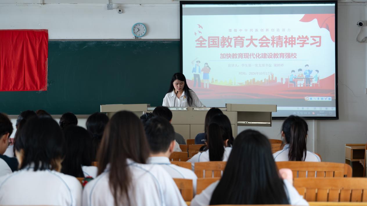 会议伊始,领学老师梁婷婷以饱满的热情和严谨的态度,带领大家深入学习习近平总书记在全国教育大会上的重要讲话精神,详细阐述了教育的战略地位、发展方向和根本任务,并结合学院实际情况,提出了具体的学习要求和行动指南。