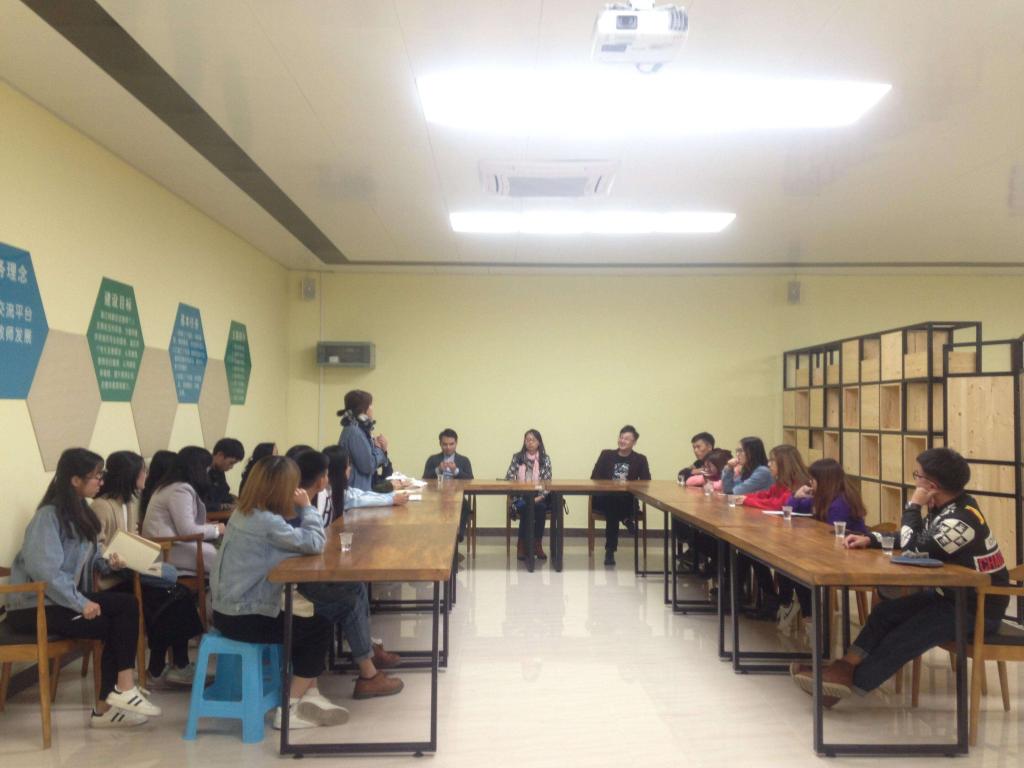 为进一步提高企业项目实训效果,深化校企合作,11月22日晚,人文学院新闻教研室鲍英英主任,李锦洪老师,特邀合作企业“广州德希恩健康科技有限公司”的项目负责人走进城建学院,同行的还有15级网络新闻与传播班的4位实习生代表,与网络新闻与传播班级项目小组成员共同围绕“轻创业”项目及“新媒体经济”进行深入探讨。