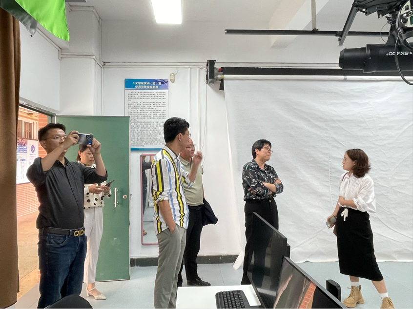 在沈亚圆、谭嘉倩老师的陪同下,刘骞一行首先参观了我校重点打造的融媒体实训基地,两位老师向来宾们详细介绍了全媒体演播厅、融媒体实训室等实训室建设、功能及使用情况,得到了来宾的高度赞赏。