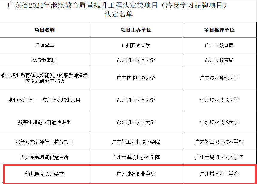 近日,广东省教育厅公布了《关于公布2024年继续教育质量提升工程认定类项目认定结果的通知》(粤教职函〔2024〕27号),我院申报的《幼儿园家长大学堂》项目获认定“终身学习品牌项目”,成为全省两所获批该类项目认定的民办高校之一,也是全校唯一获批广东省教育厅2024年继续教育质量提升工程认定类项目。