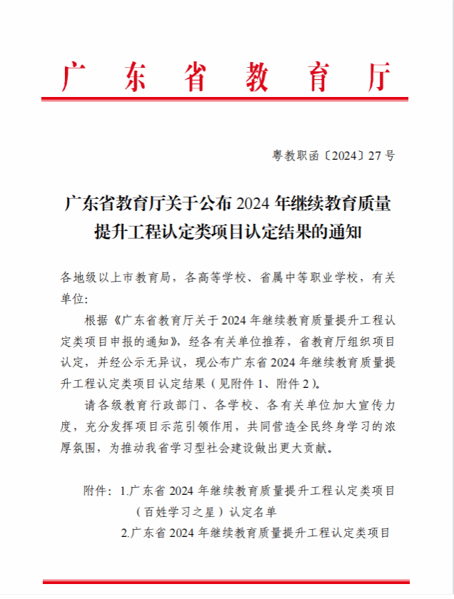 据悉,2024年广东省继续教育质量提升工程认定类项目全省共评选“百姓学习之星”40名、“终身学习品牌项目”42个。