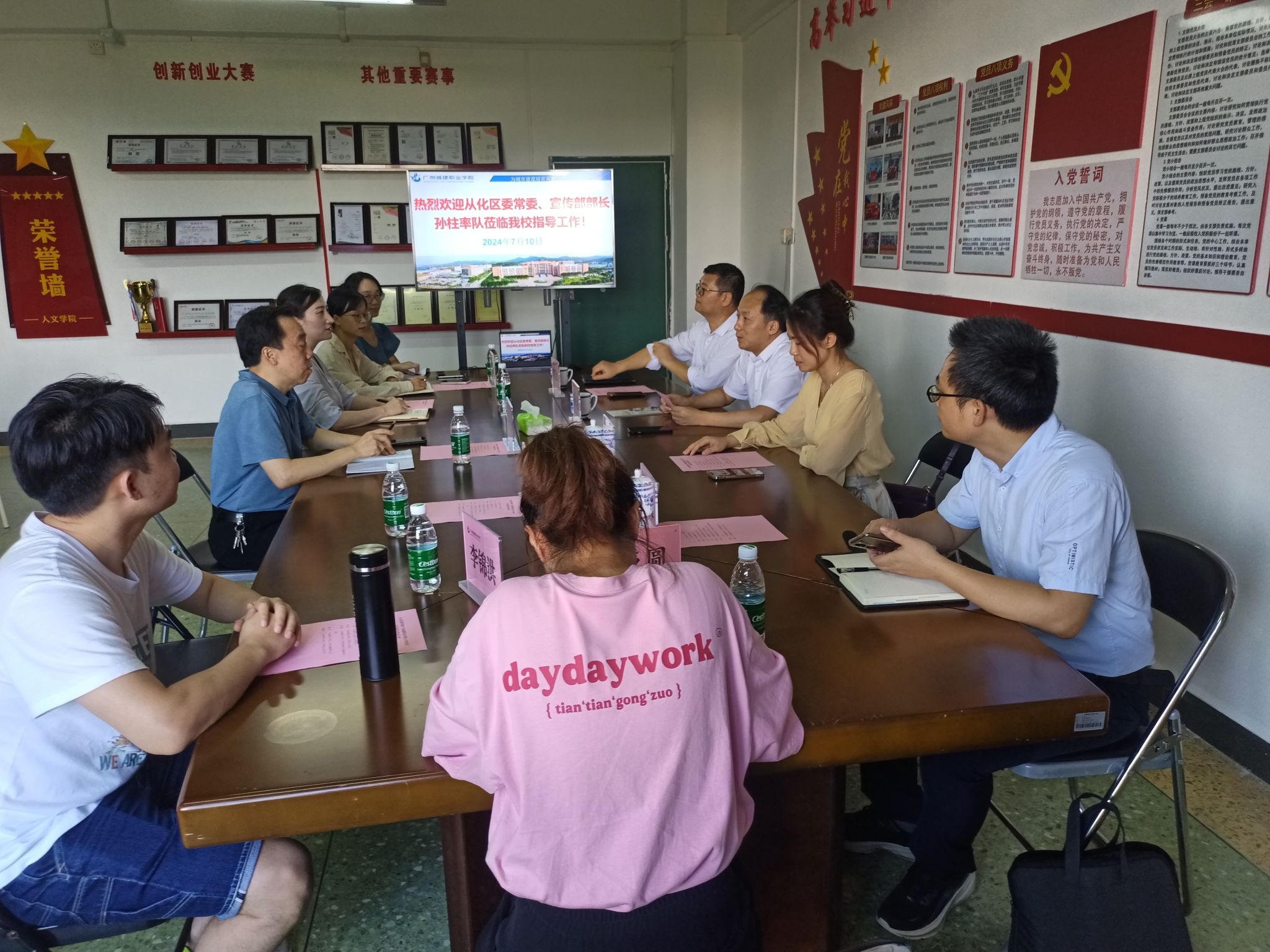 7月10日下午,从化区委宣传部长孙柱率从化区委宣传部副部长陈欢、从化区融媒体中心主任邬影红、从化区委宣传部办公室主任梁武耀来我院调研指导工作。学院院长鲁岩、副院长王婧、办公室主任李科锋以及新媒体专业群教研部部长沈亚圆、新闻教研室主任邓雨晴、策划教研室主任李锦洪、直播教研室主任廖丁莹等人参加调研座谈活动。