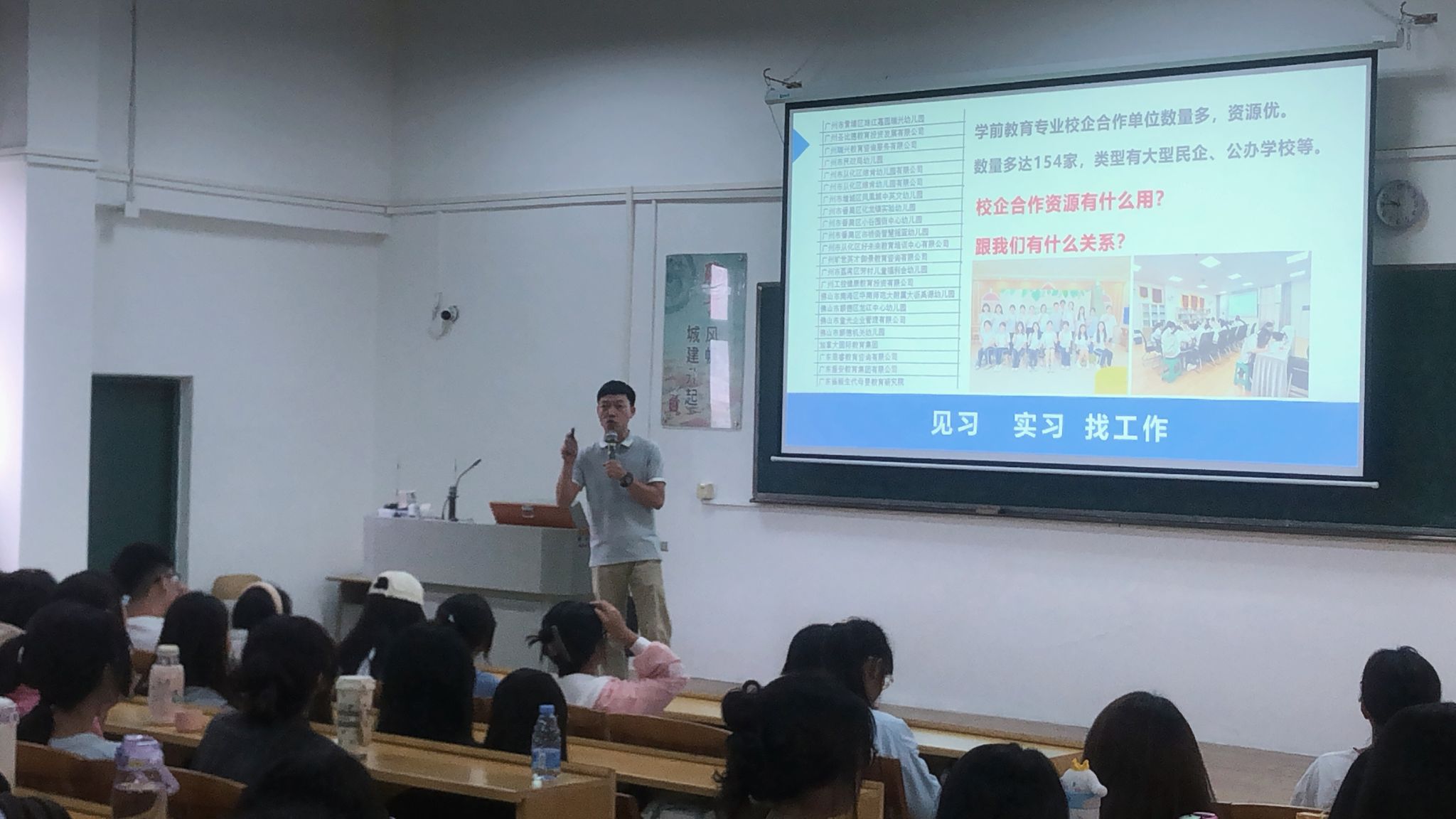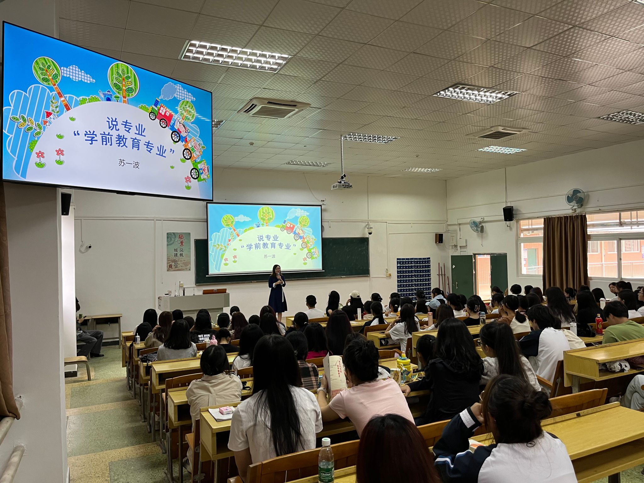 在专业教育环节,苏一波以“探索学前教育,筑梦未来之路”为题作讲座,她指出,我院学前教育专业连续两年在GDI(广州日报)高职专科专业排行榜中位居广东省民办高职院校同类专业榜首,展现了学前教育专业的办学综合实力与广泛的社会认可度。随后,她从专业培养目标、课程体系、师资力量、教学资源以及毕业要求等方面进行专业详细介绍,帮助学生初步了解了学前教育专业建设情况。