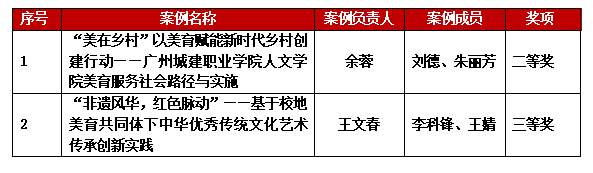 近日,由广东省教育厅举办的广东高校美育改革创新优秀案例评选获奖名单揭晓,全省本、专科学校共有259个案例上榜,我院余蓉、朱丽芳教师团队获高职组二等奖,王文春、李科锋、王婧教师团队获三等奖,这是我院教师参加全省高校美育改革创新优秀案例评选的一个突破。