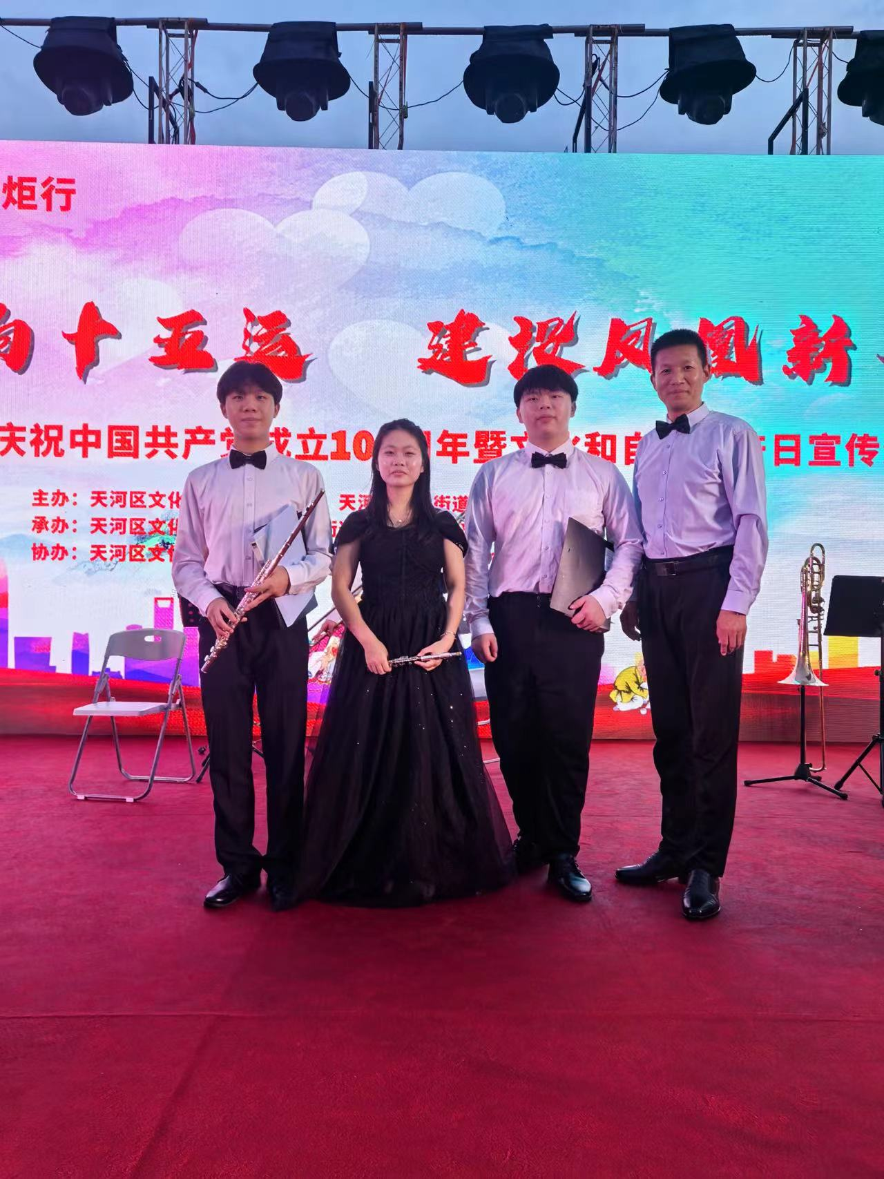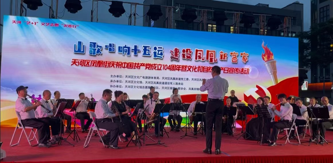 6月18日,天河区凤凰街举办“山歌唱响十五运,建设凤凰新客家”庆祝中国共产党成立104周年暨文化和自然遗产日宣传文艺演出活动。一级指挥家、我院音乐表演专业教师曾葵与林小青、凃玉栋、陈杰烽等3名学生应邀携手广州亚宇交响管乐团参与当天演出活动,向社会展示我院音乐表演专业办学实力。