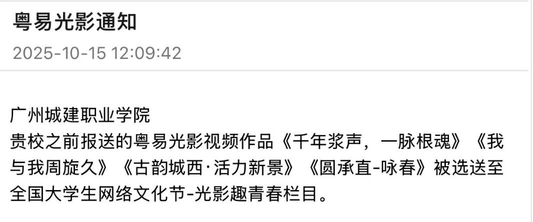 10月15日,由新媒体专业群教研室主任李锦洪指导,传播与策划专业22级学生曾琦航主创的短视频《我与我周旋久》被省教育厅推荐直通教育部、中央网信办主办的“2025年全国大学生网络文化节—光影趣青春”栏目,这是我院学子在“粤易光影”系列作品首次直通教育部赛事,实现历史突破。