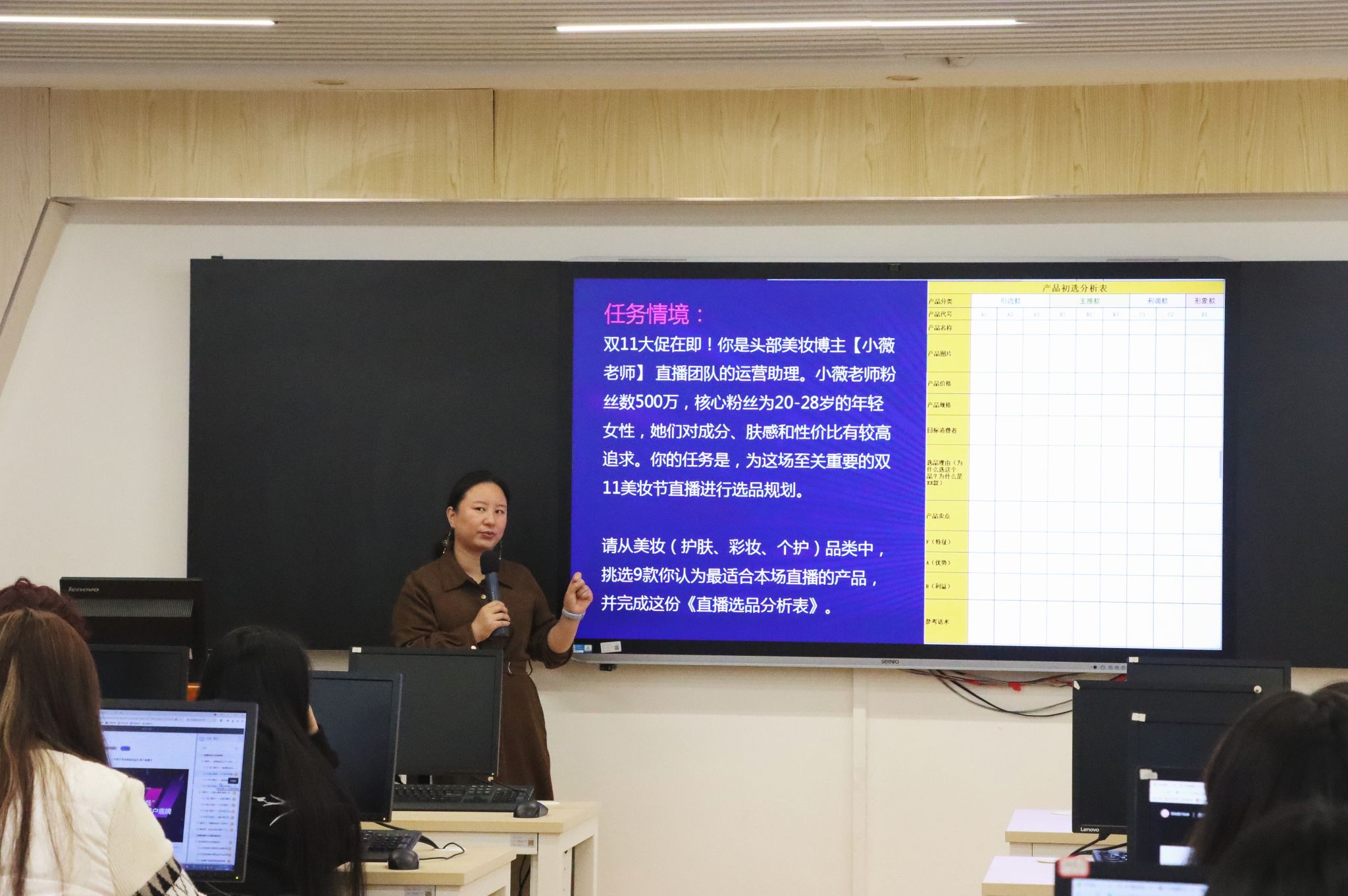 王境涵介绍了专业考核标准,她强调将采用“理论+实践”“线上+线下”双维度评价——理论考核聚焦专业知识掌握程度,实践考核则要求学生独立完成一场完整直播的策划与执行,确保所学知识能切实转化为实操能力。