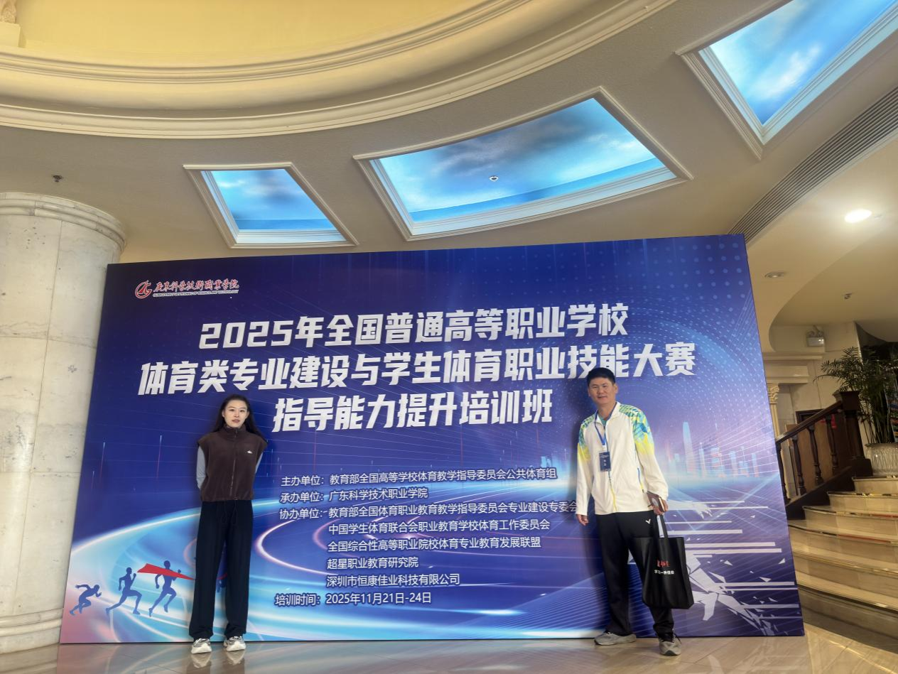 近日,2025年全国普通高等职业学校体育类专业建设与学生体育职业技能大赛指导能力提升培训班在珠海成功举办。我院公共体育教研室副主任陈一勤副教授和休闲体育专业负责人赵心悦老师参加了此次培训。
