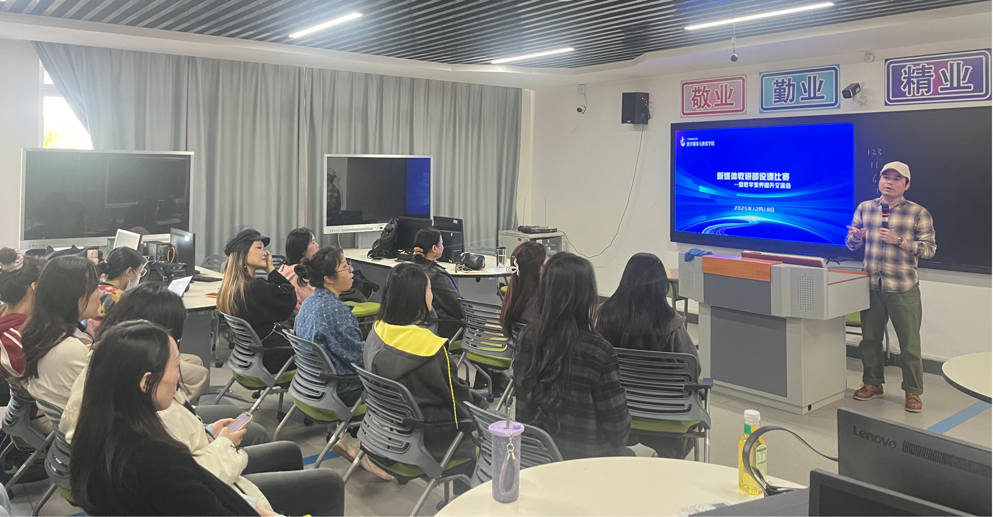 王婧作动员讲话,她强调,说课不仅是教学能力的展示,更是教学反思与同行互鉴的重要契机,鼓励教师们以赛促教、以说促改,持续推动课堂内涵建设。李锦洪则表示,本次比赛为教师提供了交流共进的平台,后续教研室将持续开展系列教学研讨活动,助力教师教学能力全面提升,为培育高素质新媒体人才夯实教学根基。
