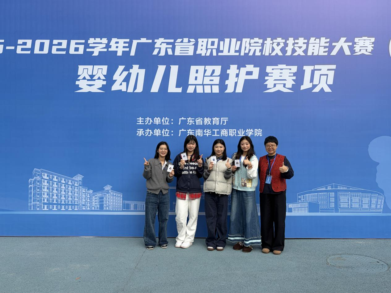 春潮涌动启新程,技能争锋展锋芒。3月5日—7日,由广东省教育厅主办的2025—2026学年广东省职业院校学生技能大赛(高职组)婴幼儿照护赛项在广东南华工商职业学院隆重举行,吸引了来自全省50所职业院校、数百位学生技能精英同台竞技。由我院学前教育教研室邹海燕、黎文娴两位老师指导,何宝珠、向裕丹、蔡少君三位同学组成的竞赛团队不负众望,凭借世界级冠军实力与精湛综合素养强势突围荣获全省一等奖,为我院参加广东省2026年职业院校学生技能竞赛赢得开门红。