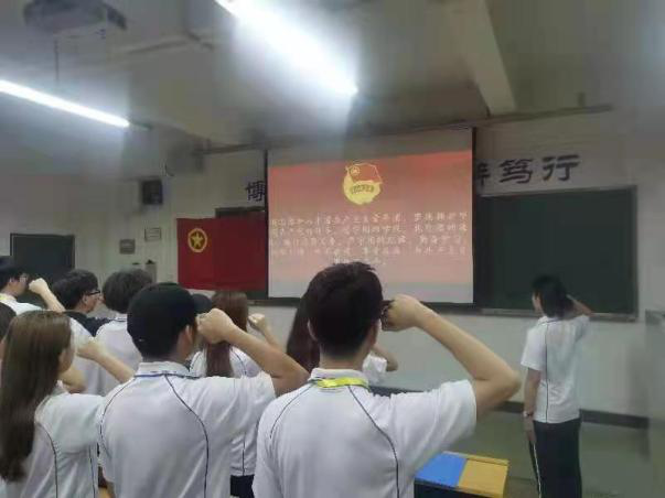 活动期间,林海容同学作为学生代表朗诵了习近平总书记在清华大学考察的重要讲话篇章,全体成员认真聆听,记录笔记。随后各组织成员互相讨论,围绕习近平总书记对社会主义大学办学规律、教书育人规律、科技创新规律、学生成长规律进行深刻思考和理解。随后,进行重温入团誓词环节,在场全体团员起立,举起右拳面向团旗庄严宣誓。