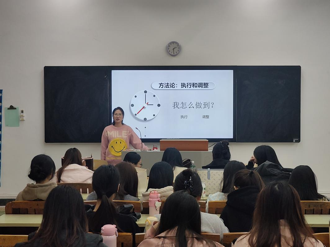 李艳霞围绕求职目标、执行、调整以及适应四个维度,引导学生系统开展职业规划,并进行就业指导。她以玻利瓦尔、钱学森等历史人物的理想箴言引入,迅速激发学生对人生目标的思考。随后,她抛出生涯九宫格,从学习、职业、人际、情感、健康等九个方面,引导学生凝练“我的一生一句话目标”。