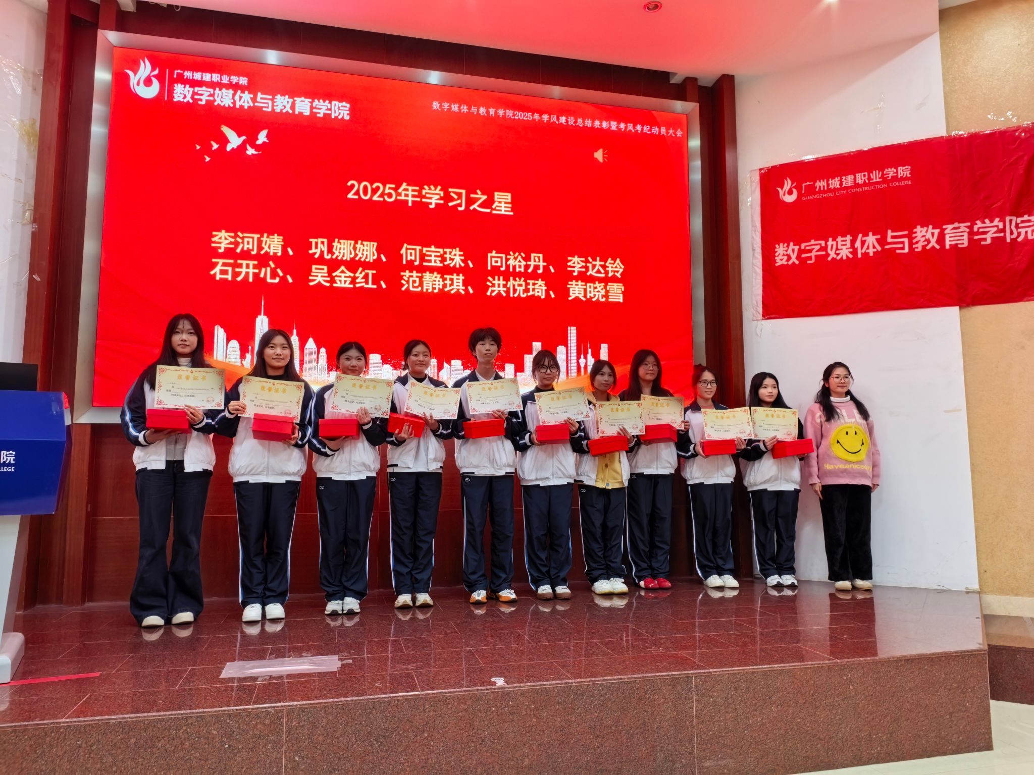 梁翠薇重点汇报了学院宣传阵地建设情况。2025年,“广州城建数媒与教育学院”微信公众号关注人数增长40%,年推送图文220篇,总阅读量突破7.5万,其中单篇最高阅读达0.22万;围绕学风建设、竞赛获奖、典型人物等主题策划专题报道77期,有效提升了学院的品牌影响力与学生归属感。