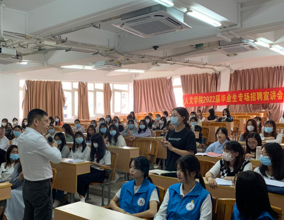 10月27日下午2:30,人文学院在信工财经楼619阶梯教室开展学前教育专业首场招聘宣讲会,中雅教育集团总经理张军平、校企合作部经理张少雪、人文学院副院长彭聪、毕业班辅导员刘颖诗、黎诗敏及2022届学前教育专业学生参加宣讲会。