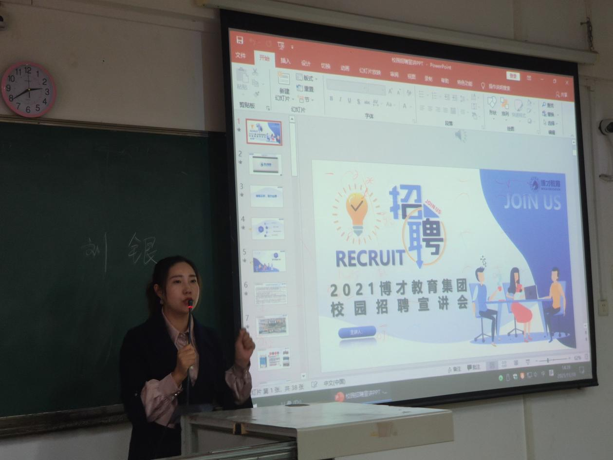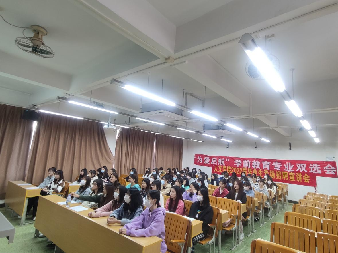 11月10日下午2:30,人文学院在人文艺术楼420教室开展学前教育专业第三场招聘宣讲会,深圳博才教育集团校企合作总监刘银女士、学前教育实习板块负责人潘燕春、毕业班辅导员刘颖诗、黎诗敏及2022届学前教育专业100余名学生参加宣讲会。