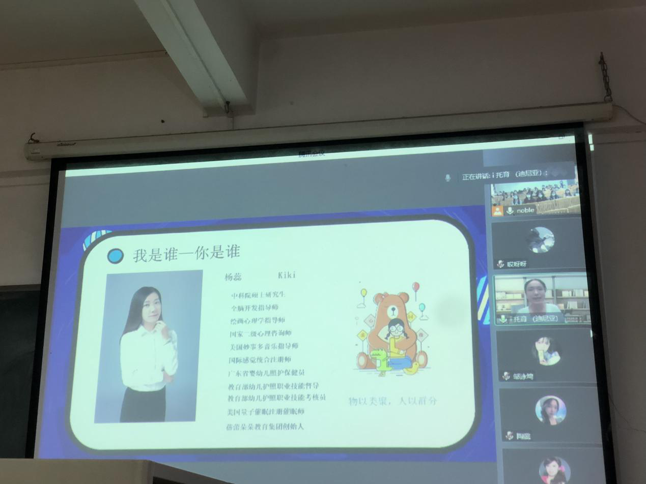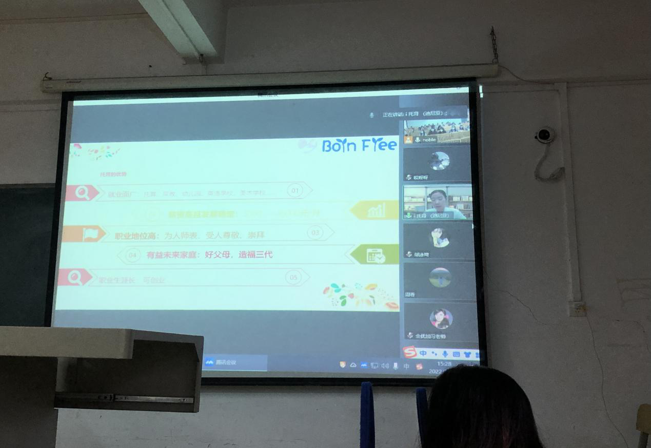 扎实做好学院2023届毕业生就业工作,为解决2020级学前教育专业毕业生岗位实习和求职就业的问题,提供更优质服务推进毕业生落实就业,11月22日下午2:00,人文学院深圳市迪尼亚文化传播有限公司举行了网络宣讲招聘会。由于疫情原因,本次招聘会采取线上线下相结合的模式开展,让所有2020级学前教育专业毕业生都参与其中。深圳市迪尼亚文化传播有限公司总经理李超、人文学院副院长朱丽芳、人文学院学前教研室主任管仲平、人文学院学前教研室副主任吴培雪以及全体2023届学前教育专业学生。