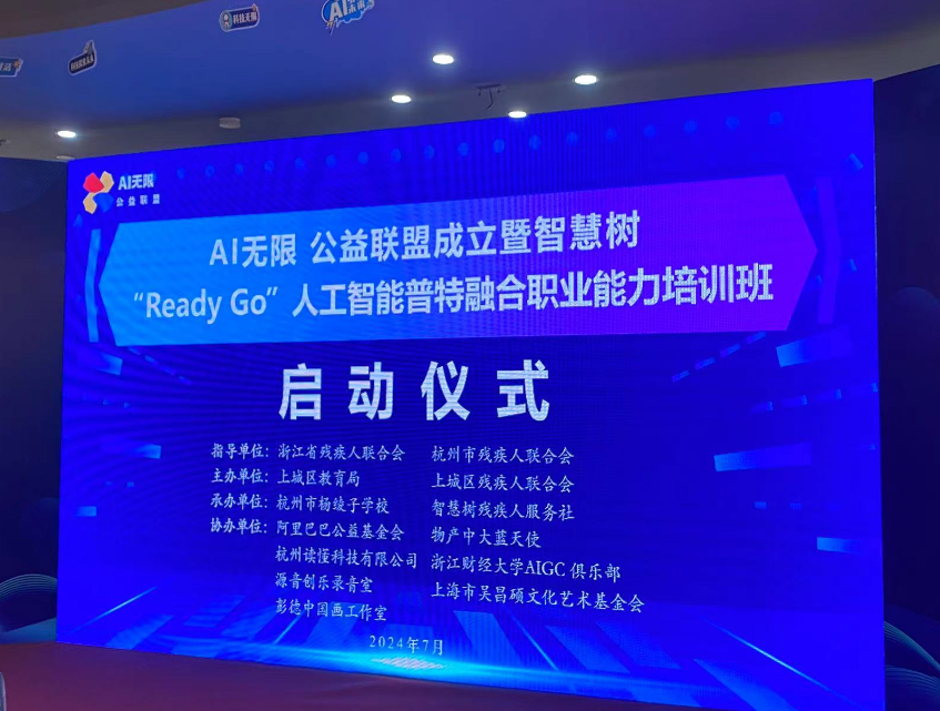 杭州市杨凌子学校是一所专门招收智力障碍儿童的特殊教育机构,而在AI这场科技浪潮中,心智障碍及其他残障人士因种种原因未能充分享受到科技带来的普惠,为了改变这一现状,太阳成集团AIGC俱乐部积极与阿里巴巴公益基金会、物产中大集团“蓝天使”志愿服务队、杭州读懂科技有限公司、源音创乐录音室、上海市吴昌硕文化艺术基金会,以及彭德中国画工作室等多家单位,共同发起成立“AI无限公益联盟”,旨在通过AI相关培训,提升心智障碍儿童必要技能,使他们能自主生活并有尊严地融入社会。