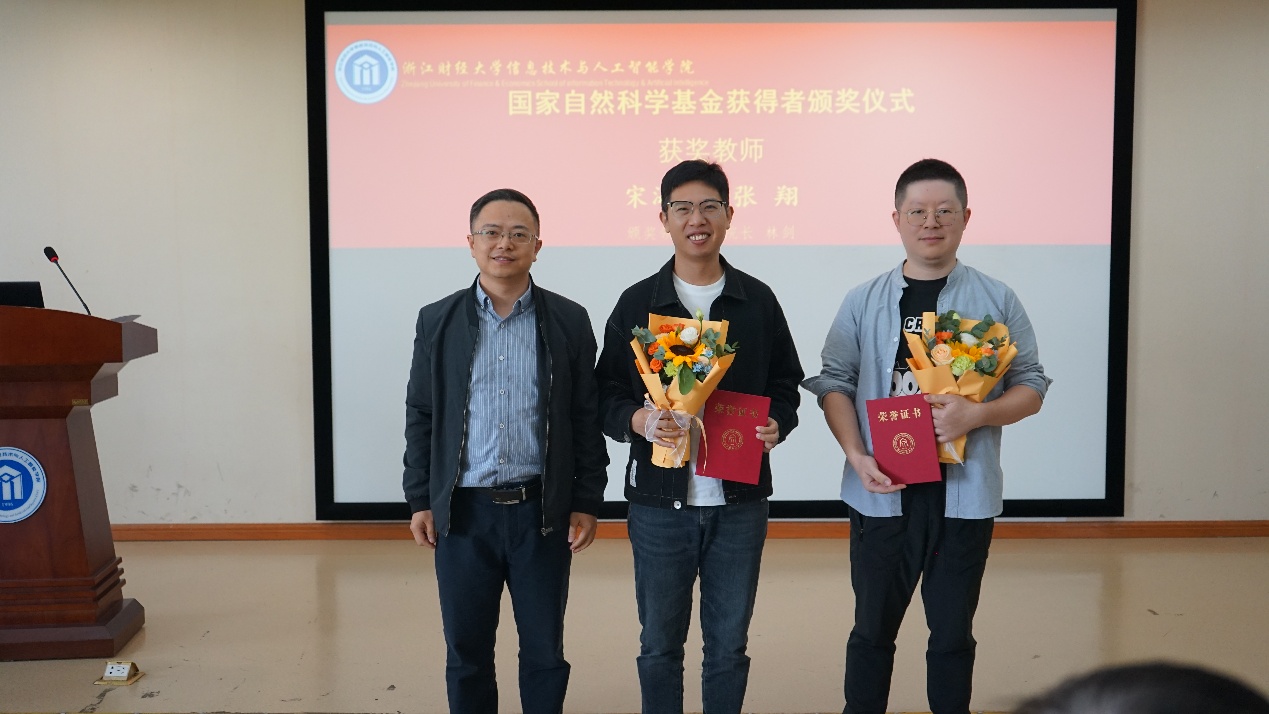 (学院副院长林剑为获国自科基金教师献花)