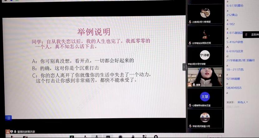 为了进一步落实心理健康教育工作,营造良好的宿舍环境,帮助心理保健员更好地认识工作职责,同时遵守疫情防控要求,人文学院于12月7日晚上8:00在腾讯会议室召开2022-2023学年第一学期心理保健员培训。本次培训由人文学院心理辅导站指导老师董蕙主讲,人文学院全体心理保健员及心理辅导站干部参与培训。
