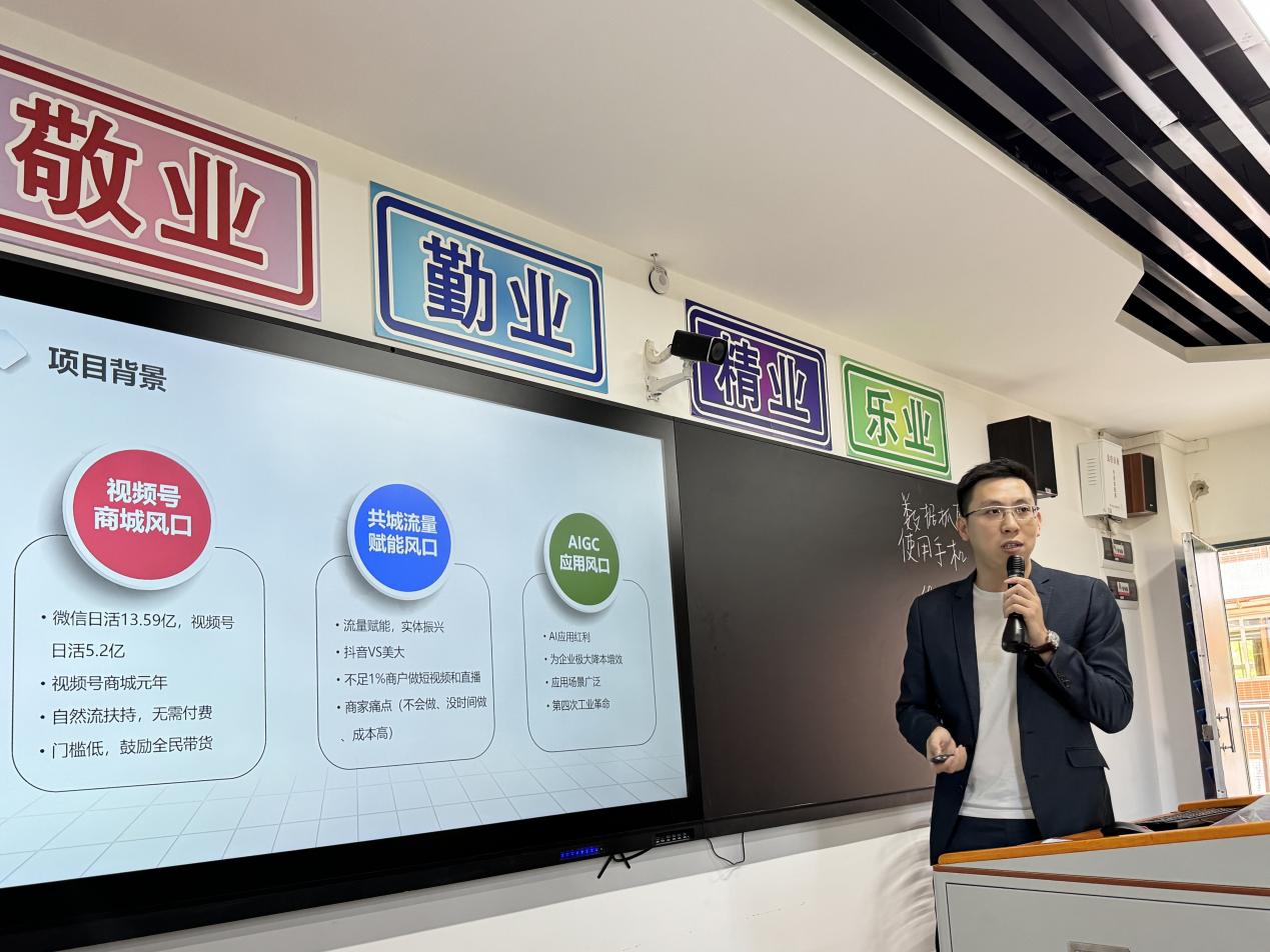 翰略科技负责人庄洲凯作培训介绍,他指出,本次培训内容包含电商行业现状、视频号生态剖析、校企合作模式、视频号运营等方面,希望本次培训活动能够帮助大家提升专业实践能力,并应用于日常的教学过程,培养更多适合于市场需求的优秀电商直播人才。其后,运营总监张野作《视频号风口及前景》专题培训,让老师清楚了解行业现状和发展趋势;视频号读稿带货模式的创始人、运营督导乔佳明作《视频号运作基本逻辑》讲解培训,让老师们掌握视频号运营的基本技能;项目经理黄晓丹女士则进行视频号平台短视频与直播大赛动员及答疑。