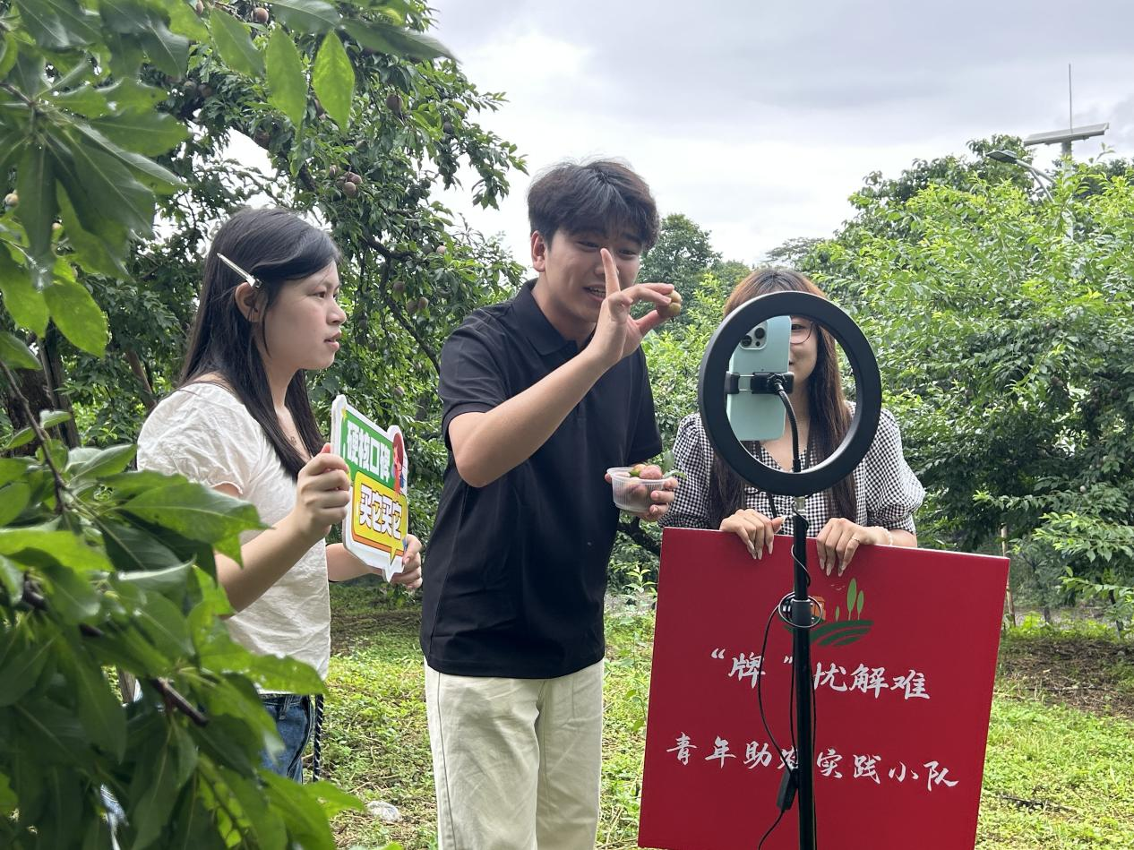 “我是潮州邱厝村人,来自农村,所以希望用自己在课堂上所学到的知识运用到实践中,我为乡村拍过短视频、下乡采访过很多村民,也曾作为队长带队走访从化街口街、东成社区等地,调研时,当农户面临农产品“卖不出去”的时候,我尝试通过拍摄短视频、纪录片帮他们将农产品推广出去。在助农的过程中,我们团队也面临很多挑战,比如,从第一次直播无人问津,到逐渐步入正轨,每次直播销量破千。”“牌”忧解难的团队负责人陈智坚说。