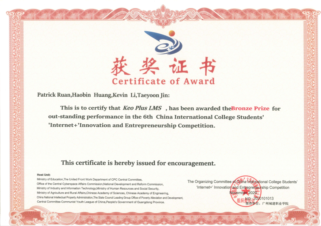 第六届中国国际互联网+大学生创新创业大赛国际赛道全国铜奖