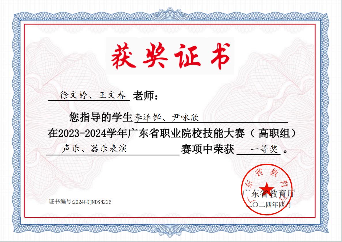 2023-2024学年广东省职业院校技能大赛声乐赛项一等奖