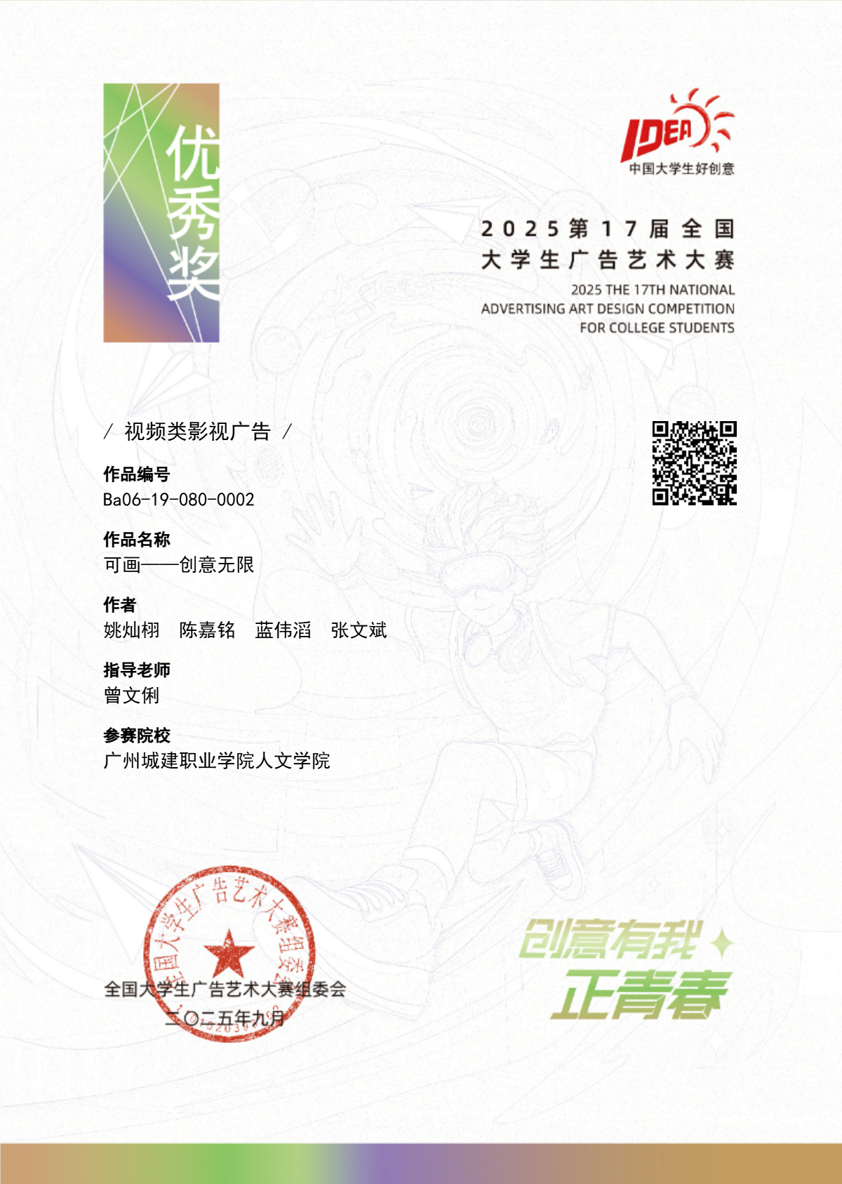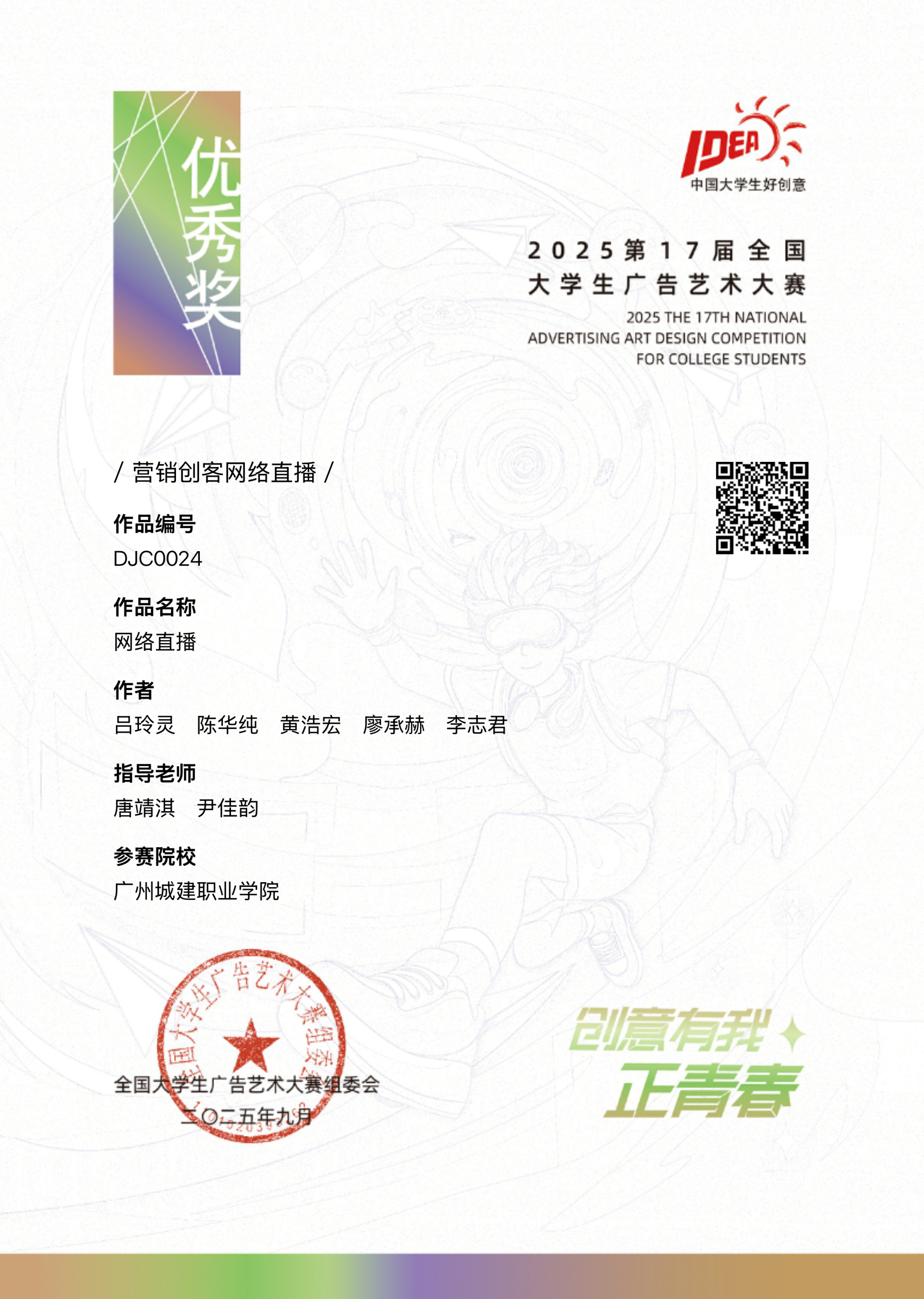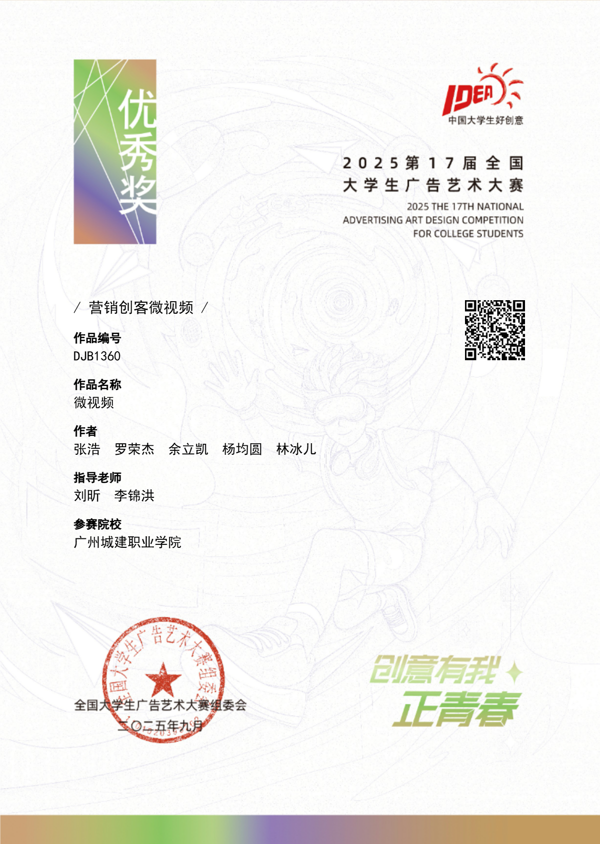 近日,第17届全国大学生广告艺术大赛(以下简称 “大广赛”)国家级奖项名单正式揭晓,我院新媒体专业群学子斩获三等奖1项、优秀奖5项,展现出较为扎实的专业能力与蓬勃的创意活力。