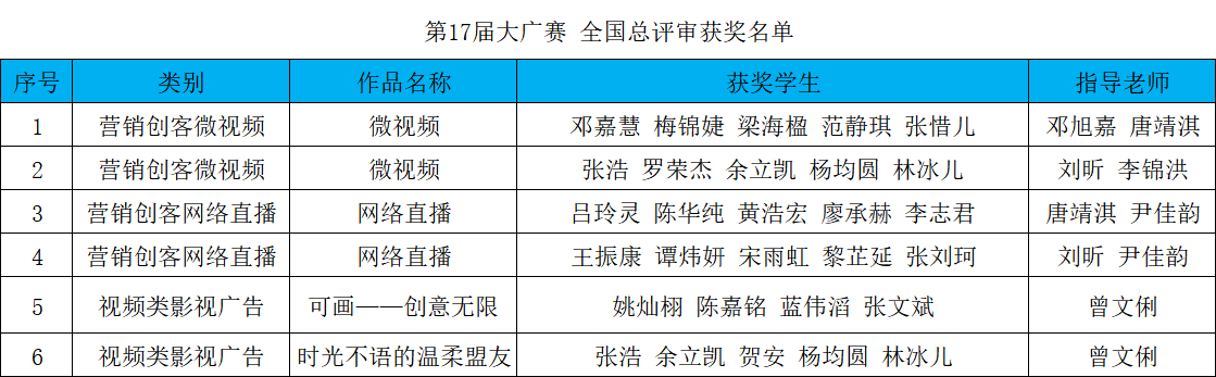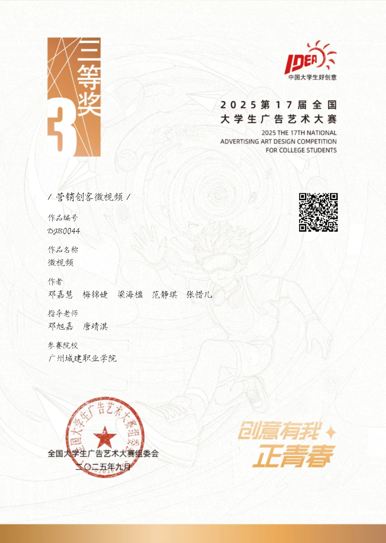 自本届大赛启动以来,学院高度重视、统筹部署,新媒体专业群教研室积极动员、多专业协同参与。备赛期间,新媒体专业群坚持以“真题真做”为导向,将赛事项目深度融入课程教学,有效激发学生创意潜能,推动理论知识向实践能力转化,真正实现了“以赛促学、以赛促练”的教学目标,为学生专业成长搭建了高水平平台。经过师生团队积极探索、精心创作,最终在600余所高校中脱颖而出,由邓旭嘉、唐靖淇老师指导,邓嘉慧、梅锦婕、梁海楹、范静琪、张惜儿等组成的学生团队荣获营销创客微视频全国三等奖。此外,还有多支学生团队作品在影视广告、网络直播、微视频等类别取得优异成绩,展现了我院学子跨媒介、多形式的创意表达能力,彰显了我院在创新人才培养和实践教学改革方面的扎实成效,也为进一步提升专业建设水平和教学质量注入了新动力。