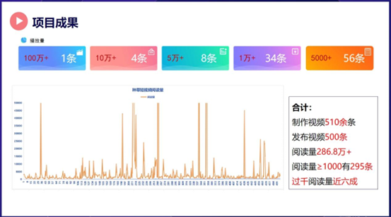 为深化产教融合,提升新媒体专业群学生实战能力,我院新媒体专业群于本学期第17周、18周开展企业真实项目实践教学活动,将校企合作单位广州人从众信息科技有限公司的“种草短视频拍摄与运营”技术服务项目融入了《综合实训》课程。历经两周的项目实践中,实践课程教学效果显著,学生共创作并发布短视频超过500条,其中有296条短视频播放量超1000次,56条短视频播放量突破5000次,更有8条短视频播放量超过5万次。