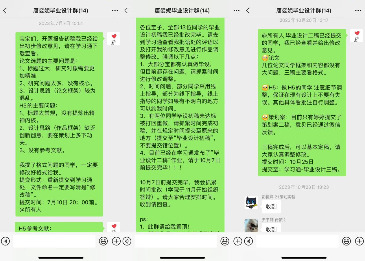 本次学生的毕业实践形式涵盖了论文、策划案和H5三个方向。经历了项目动员、拟定任务、开题、项目撰写、项目答辩、评阅、成果评定6个阶段。在这一过程中,唐老师带领学生们不断克服问题,交出了用心且达标的毕业实践作品。主要体现在3点管理过程: